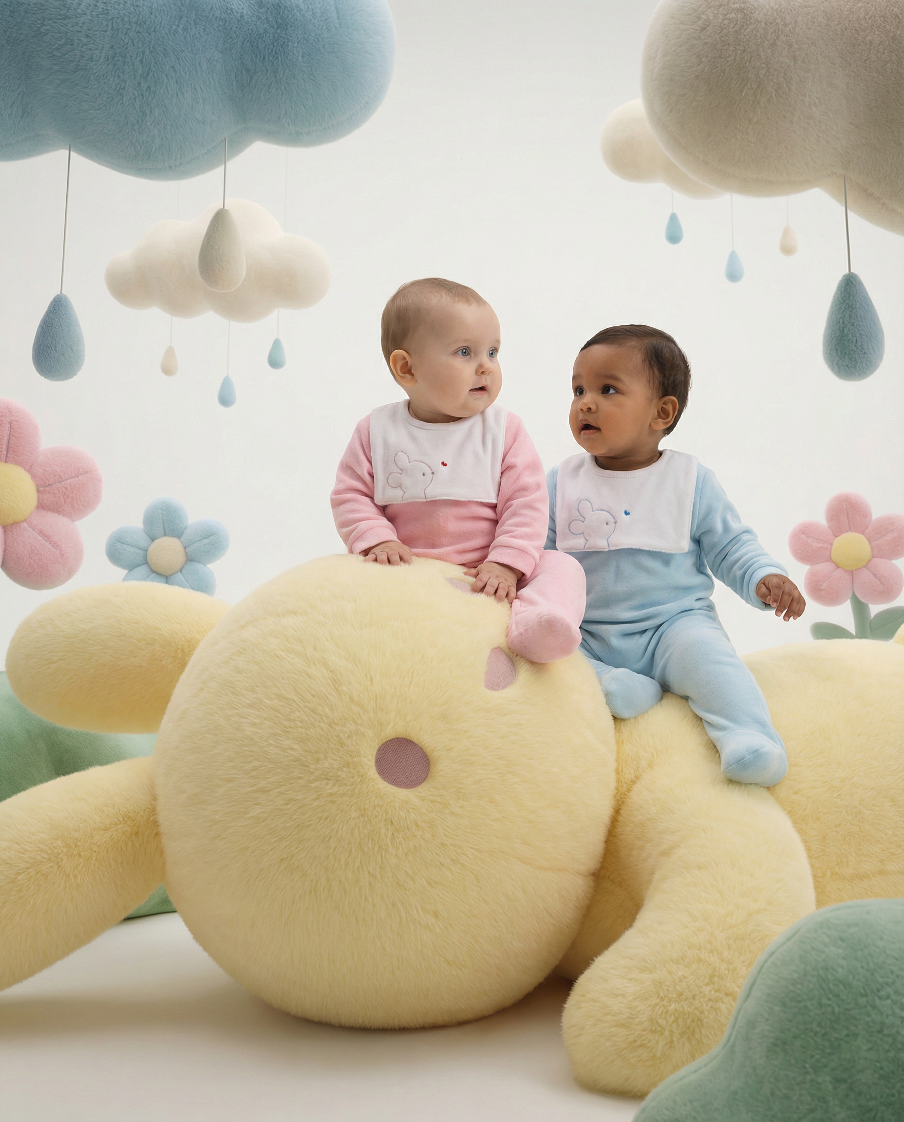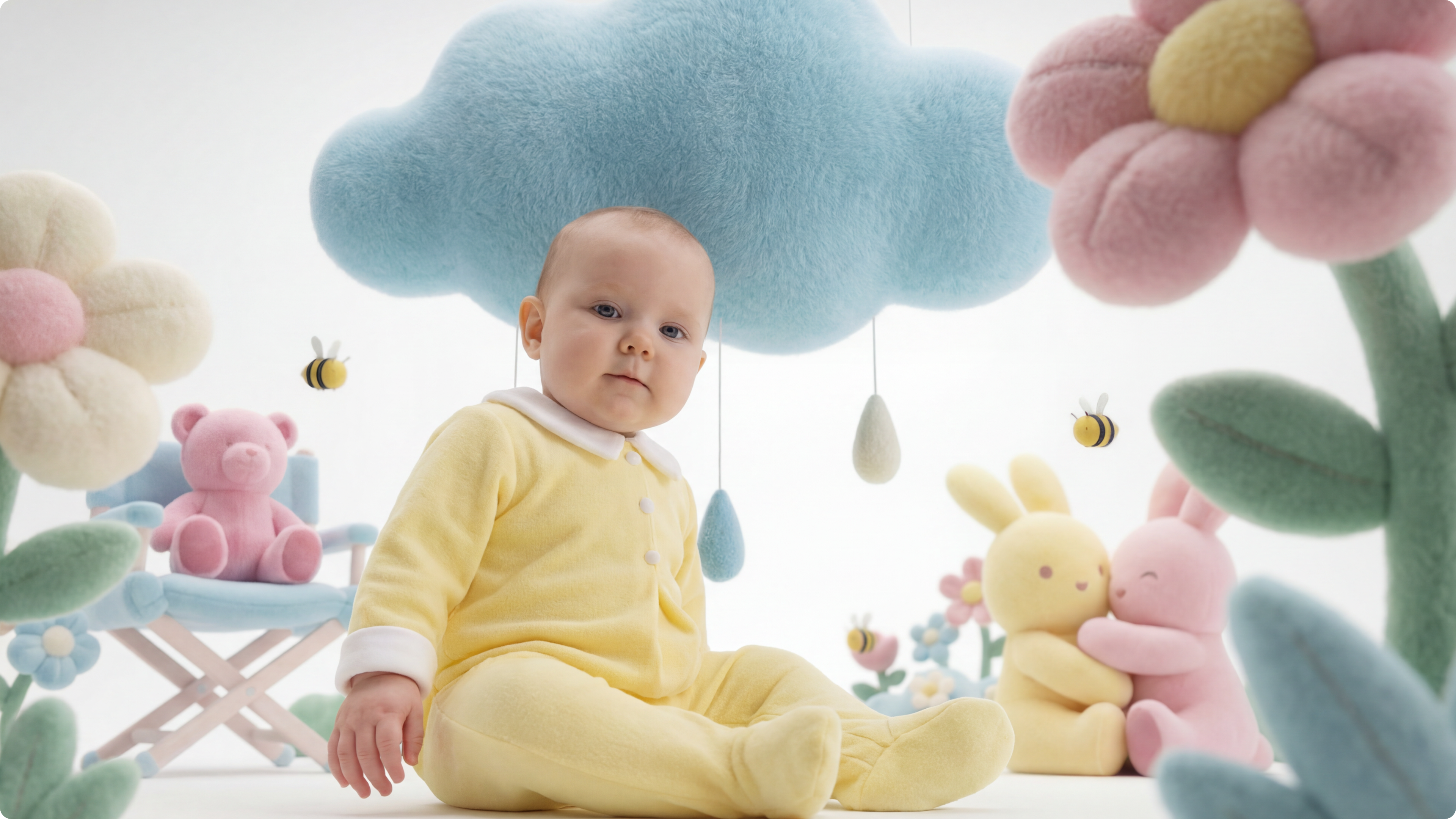 From there, art direction translates product into environment. Elements from the collection are reinterpreted as part of the scene. Clouds, bees, bunnies, and teddy bears gain volume, presence, and function within the visual storytelling. The scenario doesn’t support the product, it becomes an extension of it.