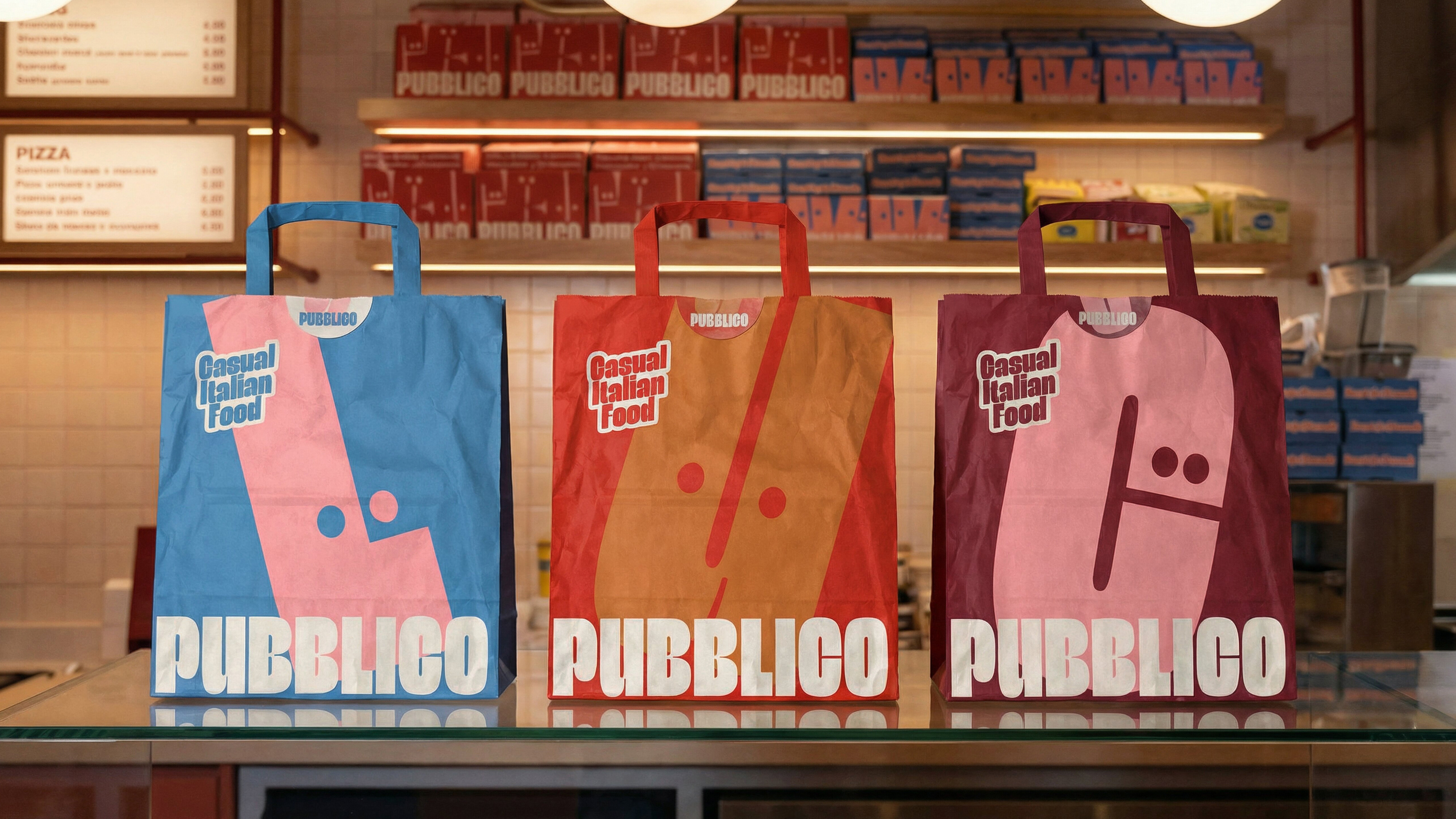 For the visual identity, we explored a vibrant palette of complementary colors—pink, blue, burgundy, cream, and orange. These tones, paired with graphic elements like checkered stripes reminiscent of traditional Italian trattorias, created a system that feels both familiar and fresh. Playful phrases were designed as stickers, easily applied to boxes, bags, and menus, reinforcing a young, energetic spirit.
